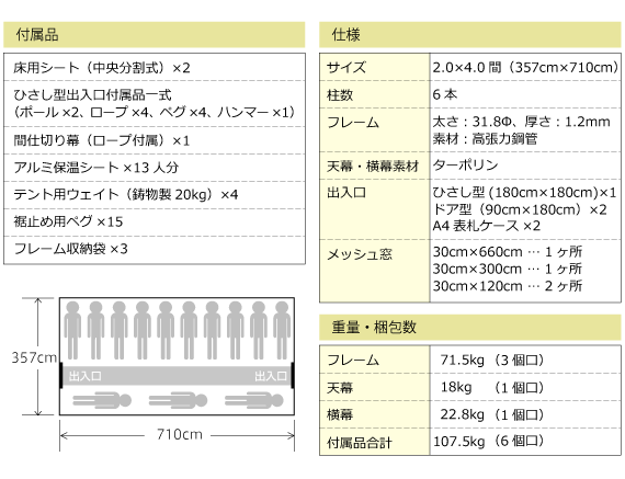 防災用レスキューテント(2.0間×4.0間) フルセット